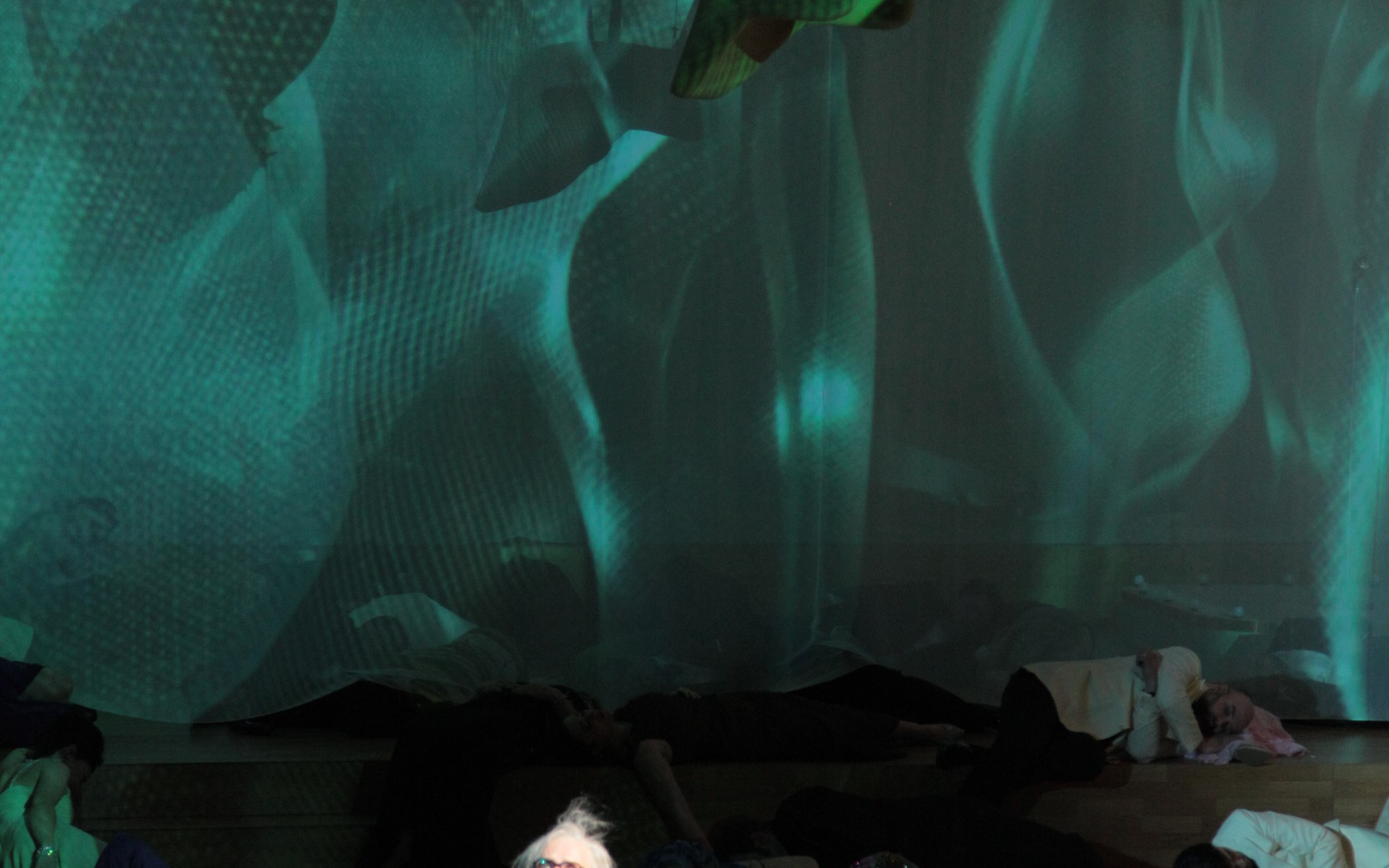 stufenweise ansteigend und gestaffelt von weißen Gazewänden, auf die immer wieder computergrafische Wellen und Windungen wie auch filmische Großaufnahmen der zentralen Protagonisten projiziert werden.“